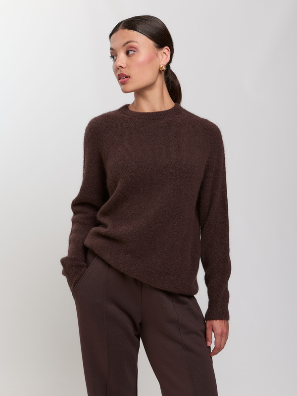 - Brązowy sweter damski z baby suri alpaki i wełny. Miękki, niegryzący, luksusowy w dotyku. Idealny do prostych spodni MOSE, marynarek i płaszczy w minimalistycznym stylu MOLARE.